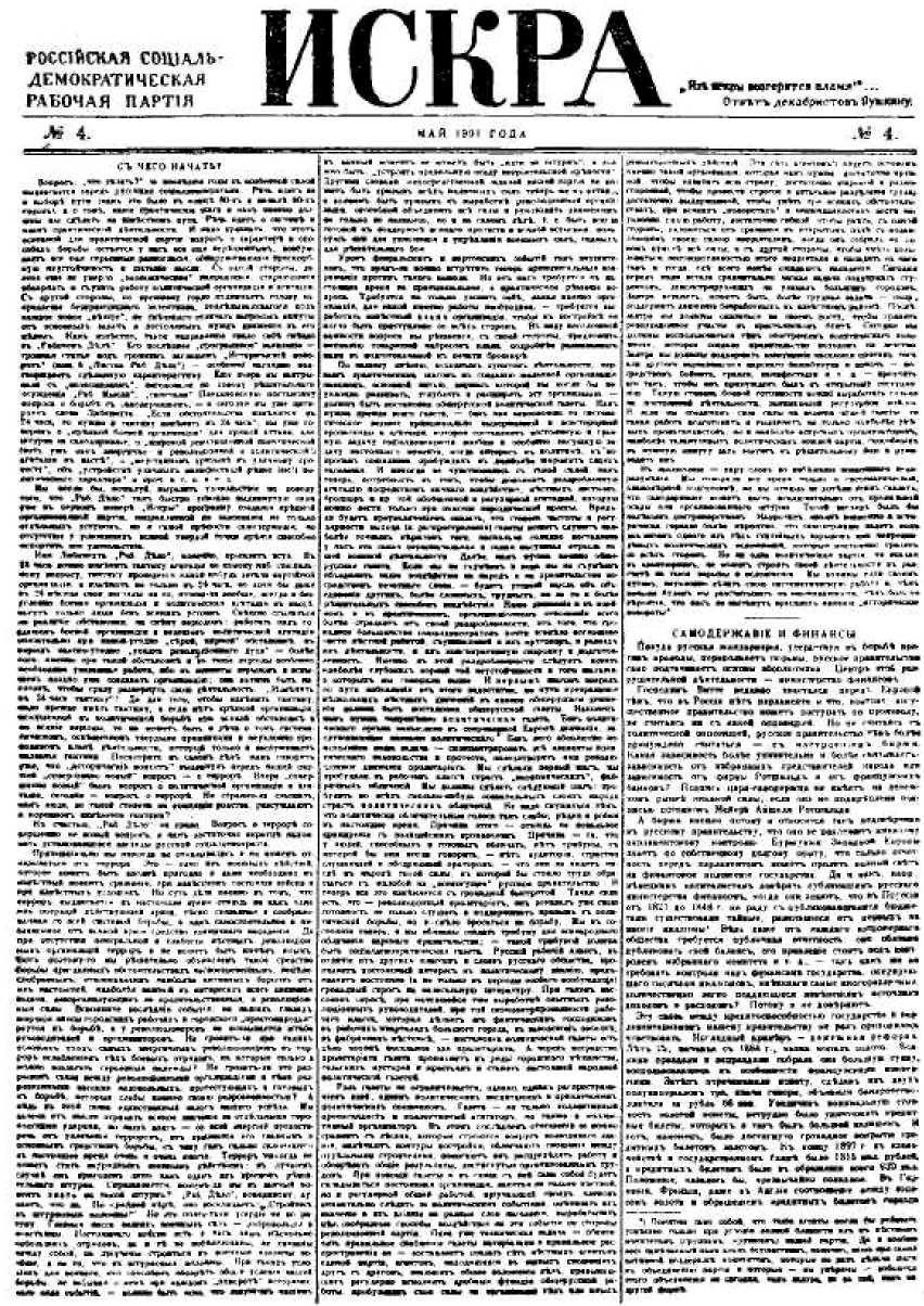 Первая страница газеты «Искра» № 4 со статьей В. И. Ленина «С чего начать?» - 1901 г. 3